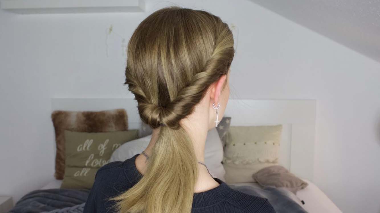 Zuerst zwirbelt ihr auf einer Seite eine Strähne eurer oberen Haarpartie ein und steckt sie vorerst zurück. Diesen Vorgang wiederholt ihr auf der anderen Seite genauso. Wenn ihr die beiden Haarsträhnen eingedreht habt, nehmt ihr sie zusammen und befestigt sie mit einem Haargummi mittig am Hinterkopf. Ihr könnt das ganze nochmals durchführen, um für mehr Glamour zu sorgen.