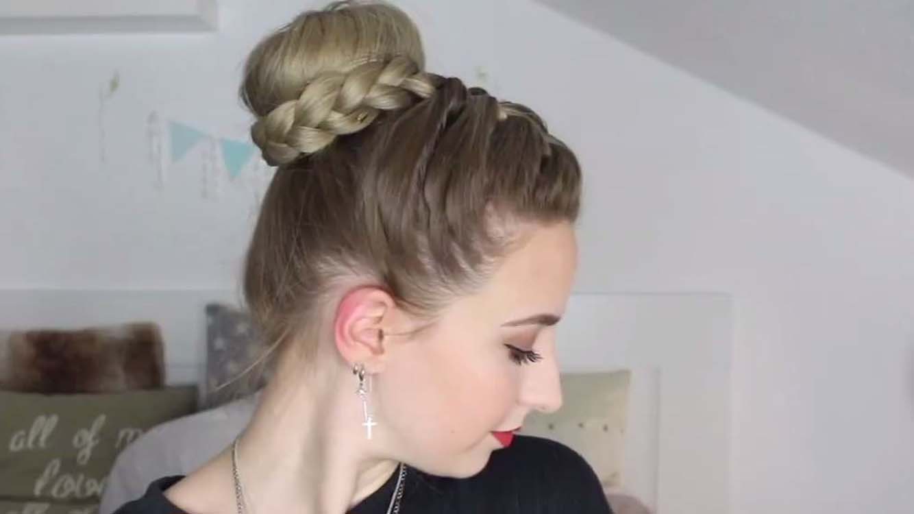 Für unsere letzte Festtags-Frisur verwendet ihr zu Beginn bestenfalls Trockenshampoo. Denn dieses sorgt für mehr Griffigkeit und Volumen, was das Ganze erleichtert. Ihr flechtet euch bis zur Mitte eures Oberkopfes einen Bauernzopf. Das heißt im Klartext: ihr nehmt euch drei Strähnen zur Hand und flechtet sie, indem ihr immer wieder neue Haarpartien dazunehmt. Wenn ihr ungefähr bei eurer Mitte angekommen seid, dann flechtet ihr den Zopf einfach normal nach unten weiter und macht ihn mit einem kleinen dünnen Gummi fest. Danach nehmt ihr alle restlichen Haare zu einem hohen Pferdeschwanz zusammen. Nun geht es weiter mit dem Dutt. Hier eignet sich zum Beispiel ein Duttkissen, mit dem ihr schnell und einfach für Halt und Fülle sorgt. Abschließend legt ihr euren geflochtenen Zopf um den Dutt herum und steckt ihn mit Haarnadeln fest.